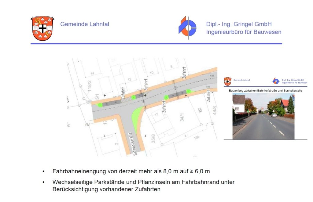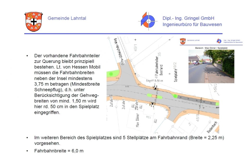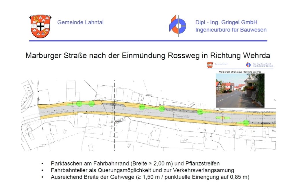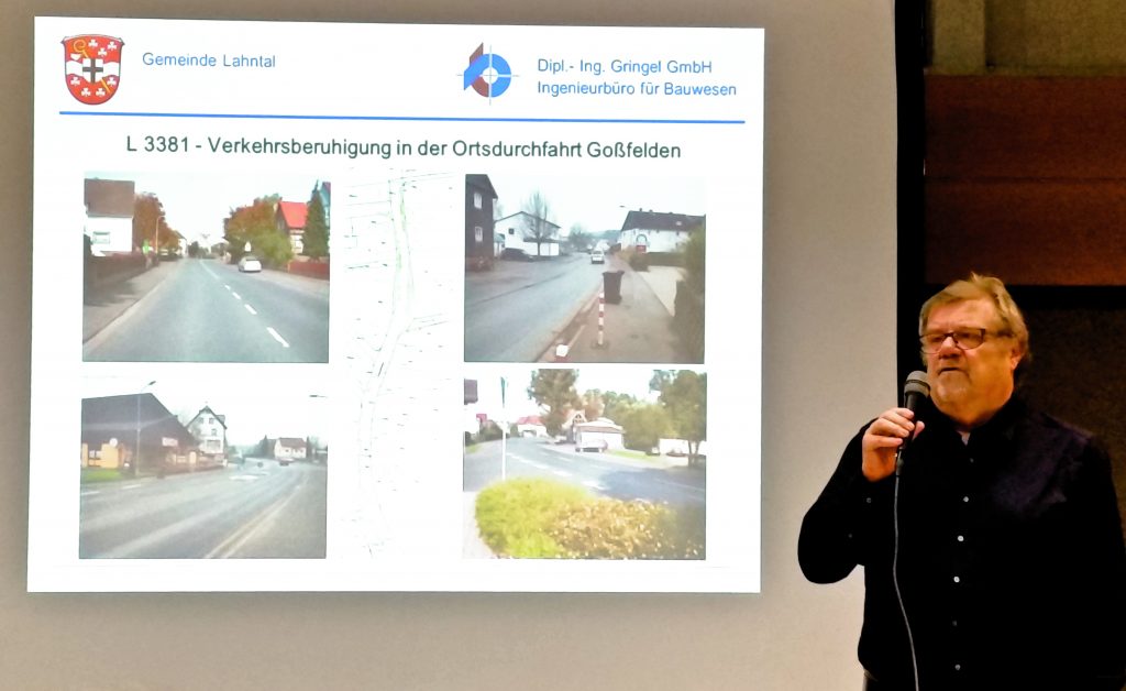 Im Mai 2018 hatten Bürgermeister Manfred Apell und Jochen Kempf sowie Laura Werner vom beauftragten Planungsbüro Gringel/Marburg in der bis auf den letzten Platz gefüllten Lahnfelshalle in Goßfelden mögliche Varianten zur Verkehrsberuhigung in Goßfelden diskutiert. Die in dieser Veranstaltung vorgestellten Entwürfe wurden zwischenzeitlich vom Büro Gringel entsprechend der Bürgerwünsche überarbeitet.