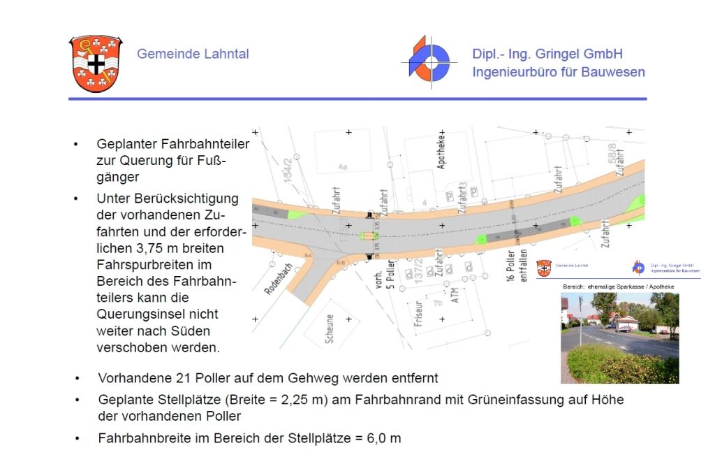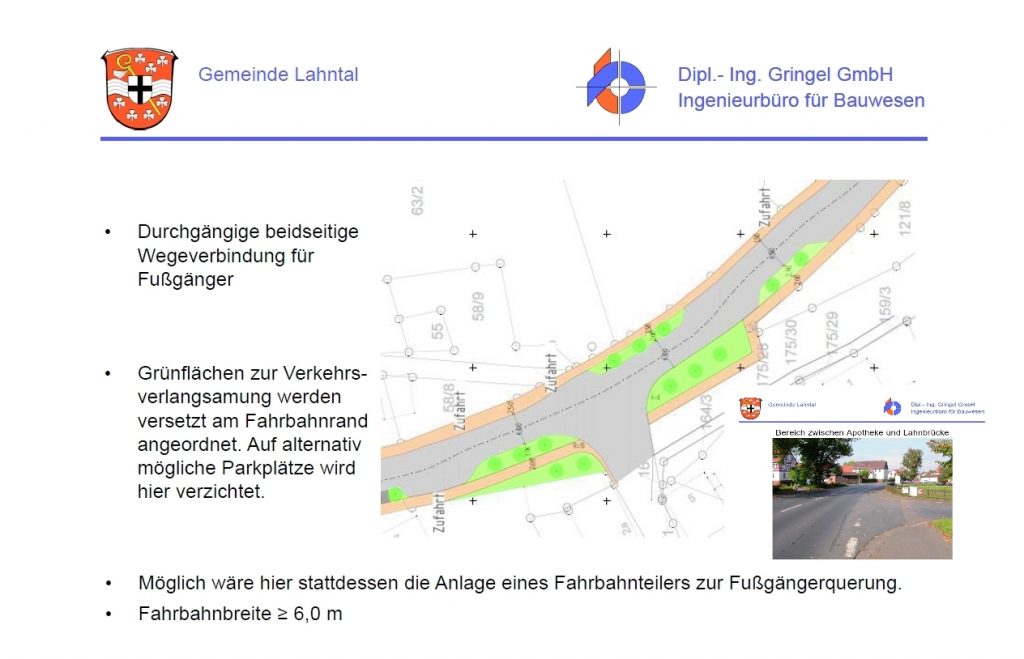 Auf einzelne Wünsche aus dem Plenum nach Zebrastreifen oder Ampelanlagen teilte Bürgermeiste Apell mit, dass wie an anderen Stellen in Lahntal, die vom Gesetzgeber hierfür geforderten Verkehrsschnittmengen sowohl für den Fahrzeug- wie auch den Passantenverkehr im 24-Stunden-Mittel nicht erreicht werden. „Zebrastreifen“ vermitteln darüber hinaus eine auch trügerische Sicherheit, da die Fußgänger sich nie sicher sein könnten, ob die Fahrzeuge auch wirklich am Streifen anhalten.