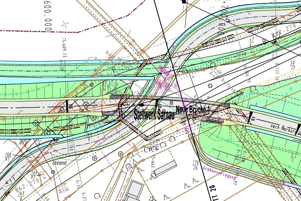 - Verlegung der Bahntrasse auf einer Strecke von etwa 600 Metern bei Sarnau um rund 30 Meter weiter nach Osten