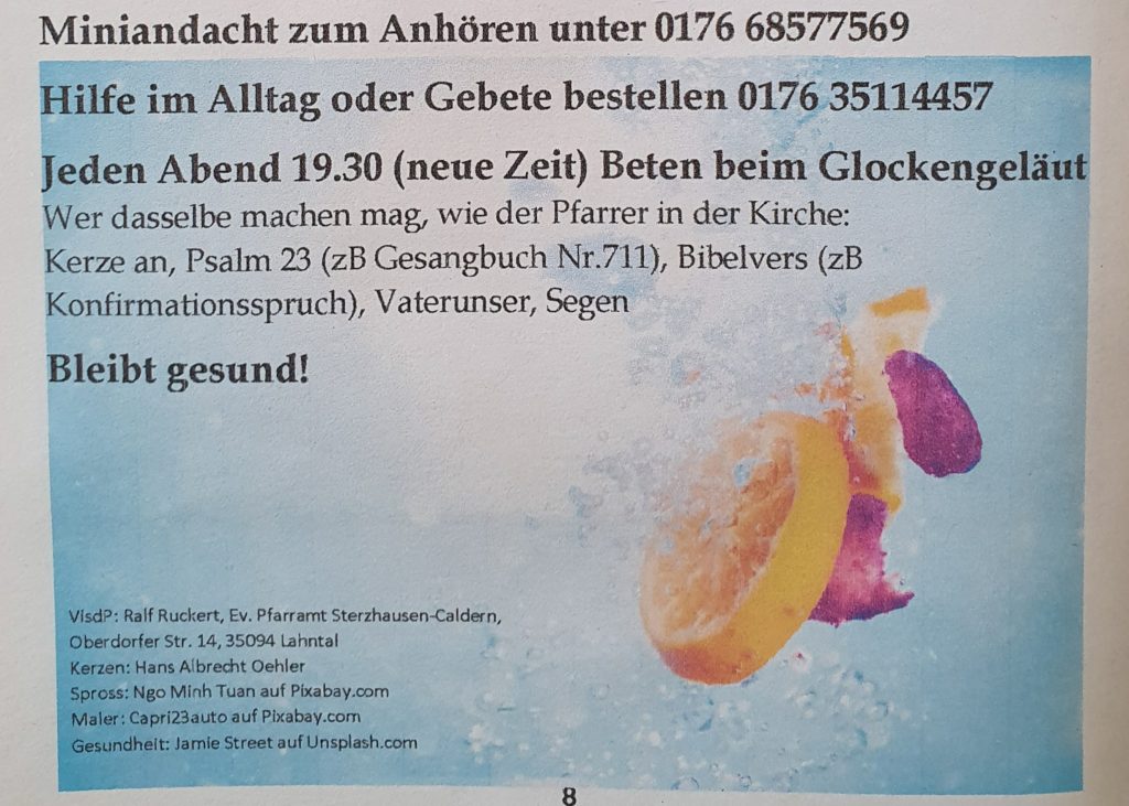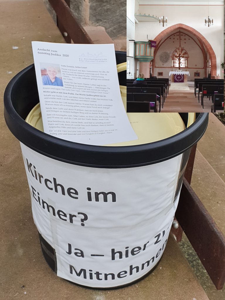 Ab dem 29. März liegt vor jeder der Lahntaler Kirchen eine Andacht in Papierform zum Mitnehmen bereit.Mit dem launigen Spruch „Kirche im Eimer“ ist zum Beispiel vor dem Eingang der Sterzhäuser Kirche ein Eimer zu finden, in dem sich die Andacht befindet.