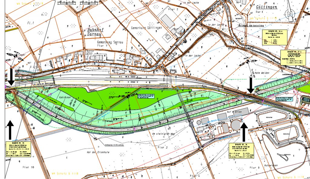 Nach Fertigstellung des Kreuzungsbauwerks BW 25 (siehe Karte) überführt diese Brücke die neu verlegten Bahntrassen, die B 62 und den Lahntalradweg. Zeitgleich erfolgt der Neubau des Kreuzungsbauwerks BW 26 in Höhe des Klärwerks Sarnau. Mit dieser Brücke werden die Bahnlinie nach Cölbe und der Lahntalradweg ein weiteres Mal überführt.