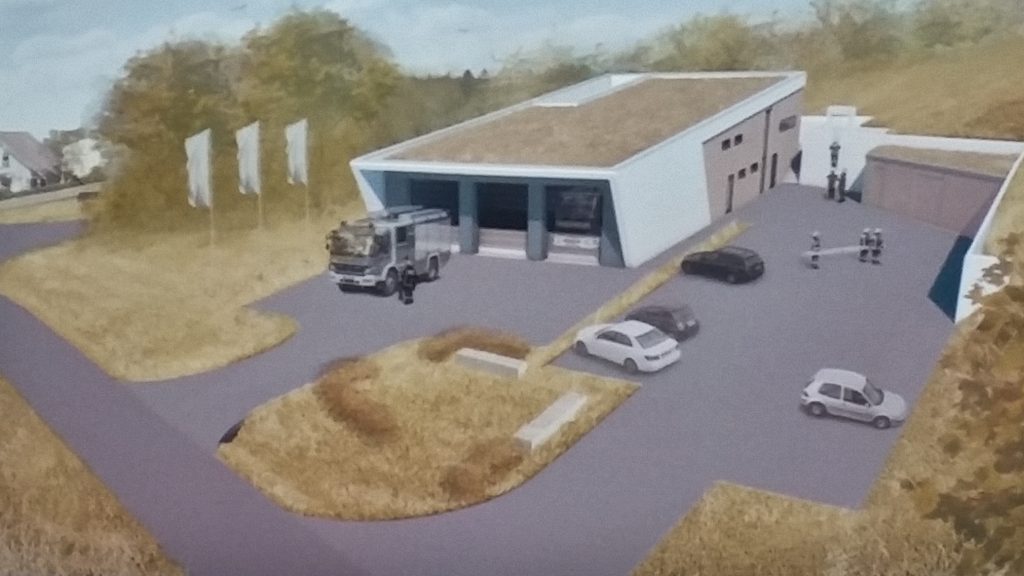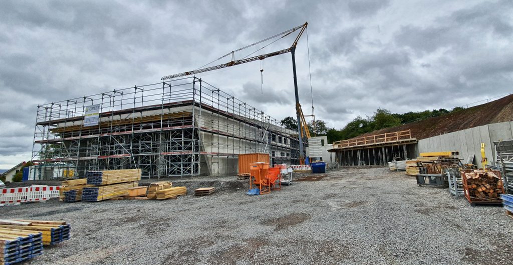 Als nächste Arbeiten stehen derzeit der Einbau der Fenster und nach Austrocknung der gegossenen Fahrzeughallendecke der großen Tore der Halle an. Daran anschließen können die Estricharbeiten und der Innenausbau unter „winterfesten Bedingungen“ = Heizung.