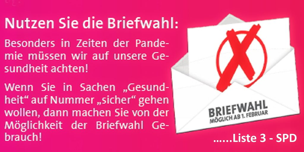 Das Listenkreuz (Liste 3: SPD) ist zwar schnell gemacht, aber wer einzelnen unserer Kandidatinnen und Kandidaten darüber hinaus mit bis zu 3 Kreuzchen seiner besondere Wertschätzung Ausdruck geben will, hat dafür bei der Nutzung der Briefwahl natürlich mehr Zeit. Achtung: In diesem Fall dürfen höchstens 31 Kreuzchen verteilt werden !!