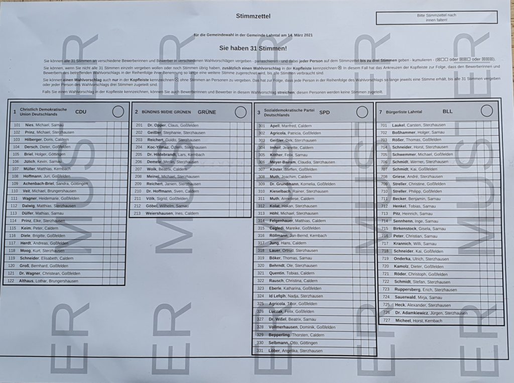 Mit dem Muster-Stimmzettel, welcher dem aktuellen „Lahntal-aktuell“ beiliegt, kann man zum Beispiel für das Gemeindeparlament schon einmal „probewählen“, bevor die zu beantragenden Briefwahlunterlagen im Briefkasten liegen.