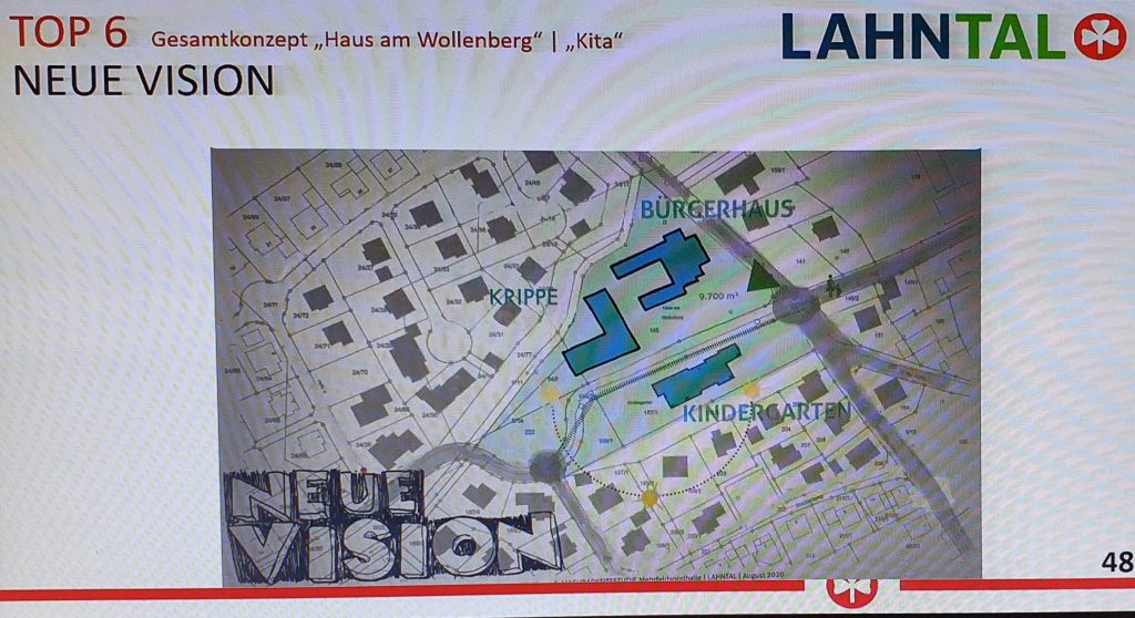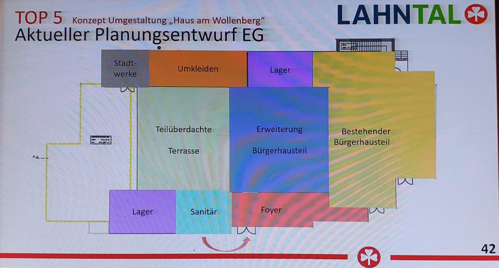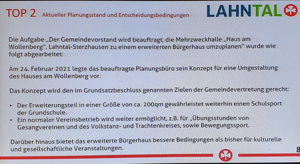 - Der Gemeindevorstand der Gemeinde Lahntal wird beauftragt, die Mehrzweckhalle „Haus am Wollenberg“, Lahntal-Sterzhausen zu einem erweiterten Bürgerhaus umzuplanen und