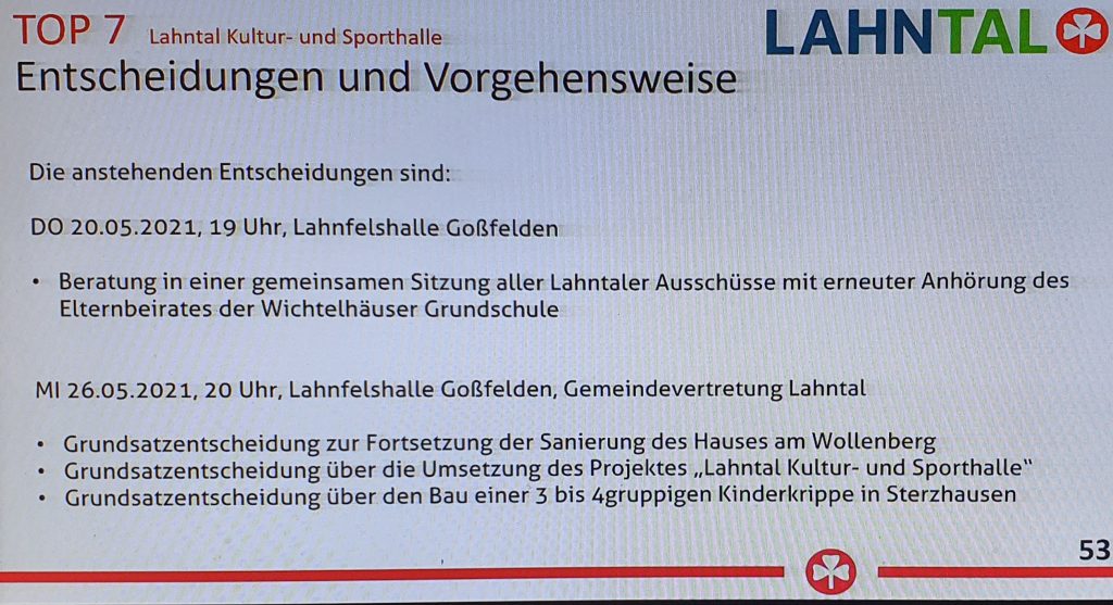 Auf diesem Hintergrund beschäftigt sich die Gemeinde Lahntal seit dem Sommer 2020 mit der Frage, ob sie es schaffen kann, zu Lasten der bisherigen Mehrzweckhallen in Goßfelden und Sterzhausen eine neue 3-Felderhalle als neue Kultur- und Sporthalle für ganz Lahntal allen Mitbürgerinnen und Mitbürgers, insbesondere aber ihrer vitalen Vereinslandschaft anzubieten.