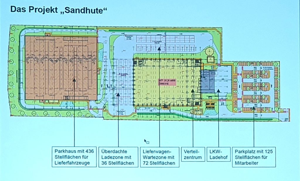 Das vorgesehene Parkhaus für die Zustellfahrzeuge werde mit einer Lärmschutzwand versehen. Das Parkhaus werde von vorneherein auch für den Zug um Zug geplanten Einsatz von Elektrofahrzeugen ausgestattet. Auch auf den Mitarbeiterparkplätzen sind Ladestellen für E-Mobilität vorgesehen.
