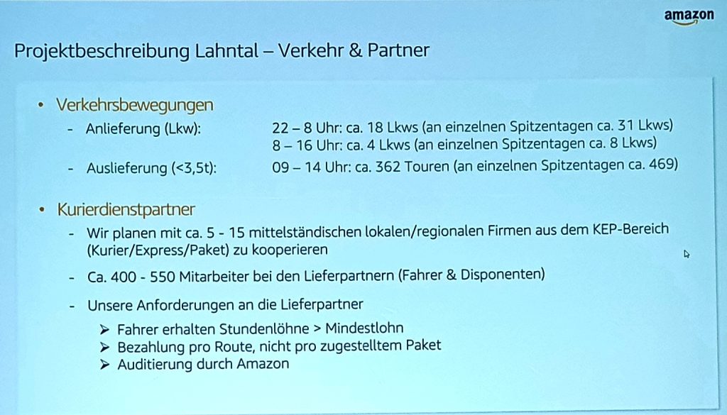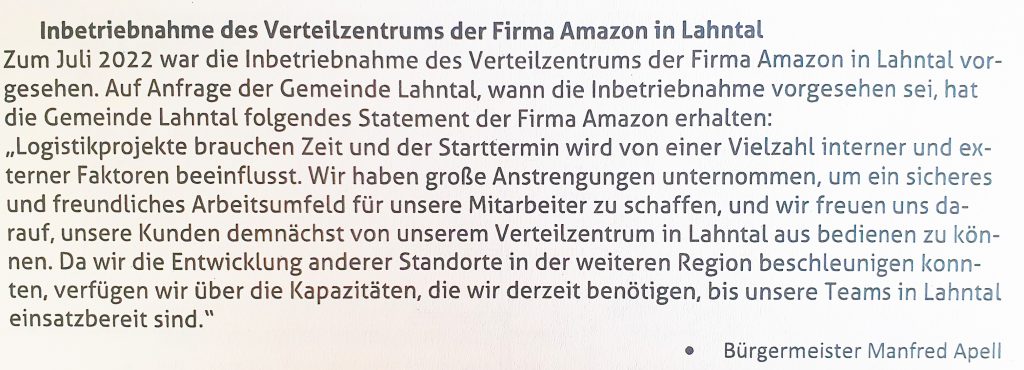 Grundsätzlich bleibt, so der Bürgermeister, erst einmal festzustellen, dass die Gemeinde auf die Grundfrage „Warum überhaupt Amazon in Lahntal-Goßfelden?“ keinerlei Einfluss nehmen konnte.