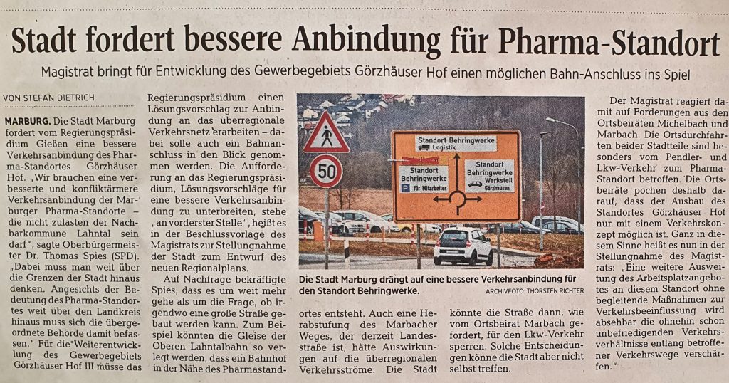 Marburgs Oberbürgermeister will laut OP vom 10.3.2022 auch keine Belastung Lahntals durch eine Ausweitung des Verkehrs des Pharma-Standorts