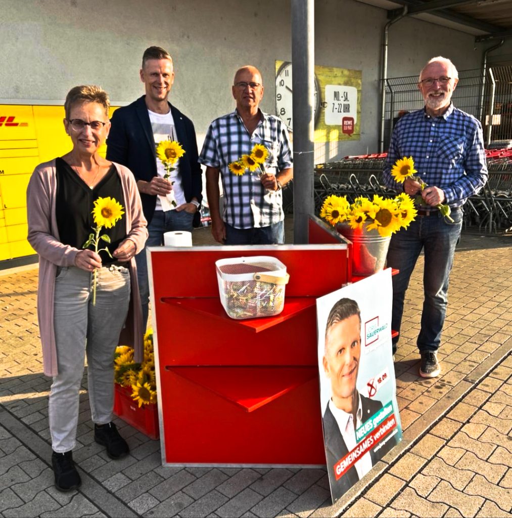 Wahlkampfteam von Jörg Sauerwald verteilt Sonnenblumen