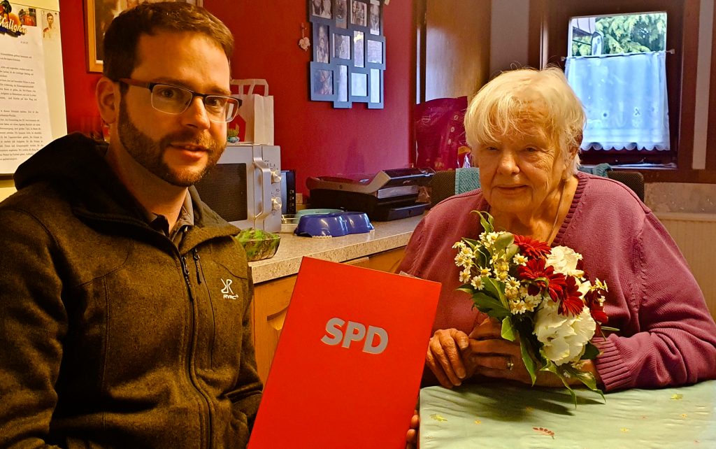 25 Jahre später überreichten die Vorsitzenden des SPD-Ortsverein Lahntal, Joachim Muth und Rainer Kieselbach der langjährigen Genossin in ihrer Wohnung eine Ehrenurkunde und Anstecknadel für ein Vierteljahrhundert Treue zur Partei. Natürlich gab es auch einen Blumenstrauß.
