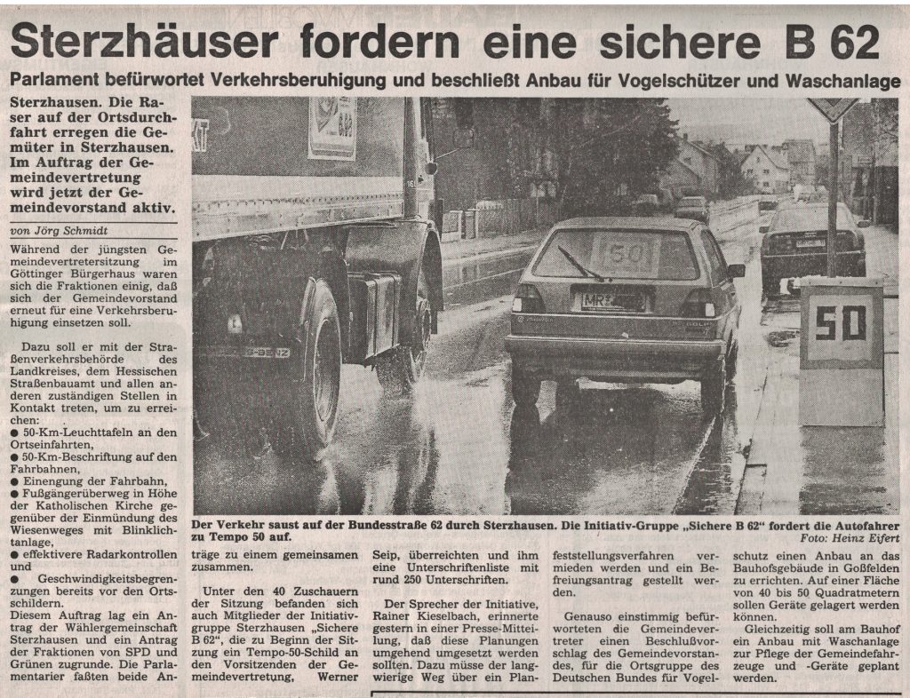 Bereits 1992 hatte die Bürgerinitiative „Sichere B 62“ mit Aktionen und Veranstaltungen auf die Notwendigkeit, den Verkehr auf der schnurgeraden Ortsdurchfahrt zu beruhigen, aufmerksam gemacht.